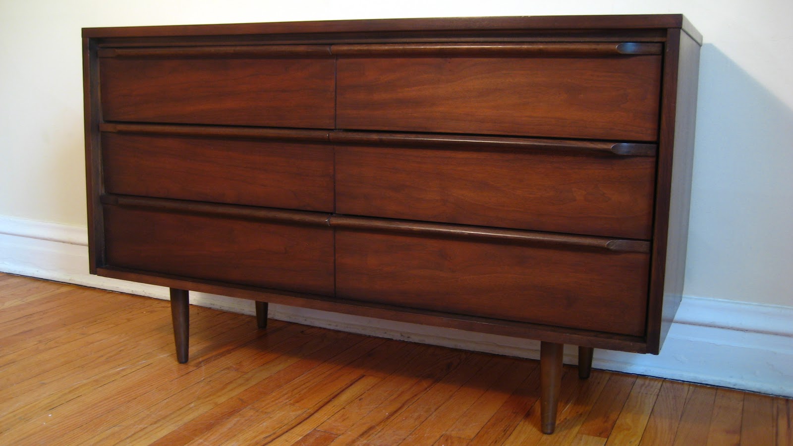 Dresser/Credenza Mid century modern dresser on tapered legs. Six drawers with thumb overpulls. circa mid 60s. Walnut w/ laminate top. 50"L x 18"D x 30"H SOLD